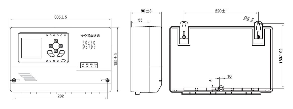 一 产品概述 采用了高性能32位嵌入式RISC CPU(ARM9内核)硬件平台和嵌入式LINUX操作系统软件平台,结合现代主流通信技术,能够灵活地配置成“远方抄表终端”、“用电管理终端”、“负控终端”等多种类型。 二 主要功能 1)上抄表功能:2路抄表RS485,可接16只电表,每只电表规约可单独设置;支持IEC1107、ZB、ZD、ZU、EDMI、ABB、ISKRA、ELSTER、ACTARIS、DL/T645; 2)远程通信:终端支持多种通信接口,用户可根据需求选取其中一种:GPRS/ /CDMA/Ethernet; 3)界面显示功能:160×160点阵式LED背光,全中文菜单式操作,6个按键; 4)维护功能:具备USB接口和维护RS-232接口,用于数据备份和升级维护,程序、参数等也可通过GPRS/CDMA进行远程升级和维护; 5)状态检测与告警:实时监测电压、电流、有功、无功、功率因数、门接点,有终端事件记录; 6)高精度时钟芯片,时钟误差≤1s/d; 断电连续运行10年;主站对误差≤2s; 电表采集周期:5分钟~1个月可设置,最小间隔5分钟,设置的采集间隔必须为5分钟的倍数; 7)后备电池:4.8V/450mAh工业可充电电池。 三 技术参数 1)额定电压:AC220V±20% 2)功耗:GPRS/CDMA不发送时,整机功耗≤4W;GPRS/CDMA发送时,整机功耗≤5W,10VA 3)输出输入回路:4路遥控接点输出,6路遥信量/脉冲量输入,1路常开告警接点 4)本地传输接口:2路RS485作为抄表口,1路RS232接维护口(可用于上传通信) 5)存储容量: 128MB FLASH 6)可靠性:MTBF≥7.6×104h 四 外形尺寸
